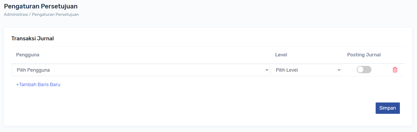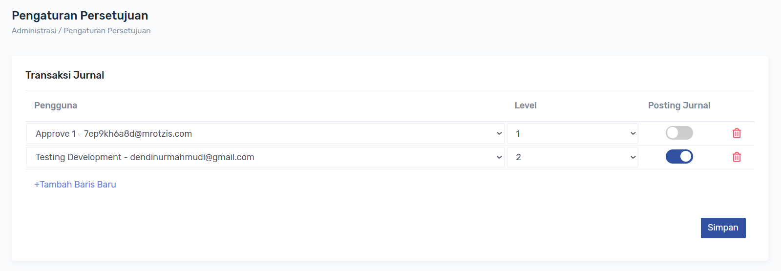 Persetujuan dibuat fleksibel, user dapat membuat approval dan levelnya sesuai kebutuhan operasional, untuk menambah approval klik link +Tambah Baris Baru, untuk menambah baris approval baru, Level dibuat dinamis sesuai baris dan dalam 1 level bisa lebih dari 1 approval, posting jurnal dapat diaktifkan di level approval tertentu, jika posting jurnal diaktifkan di level approval 2 maka ketika approver 2 menyetujui transaksi jurnal, jurnal tersebut akan terposting ke laporan.
