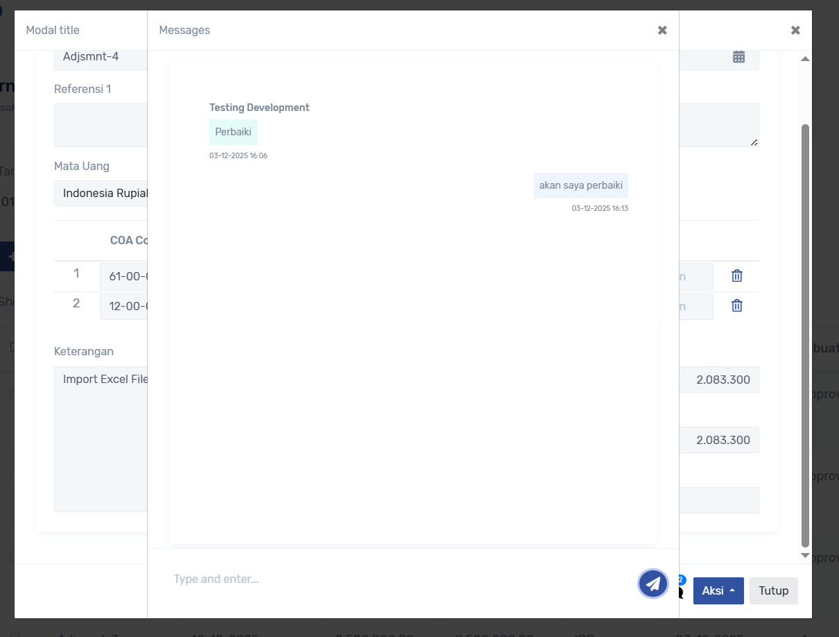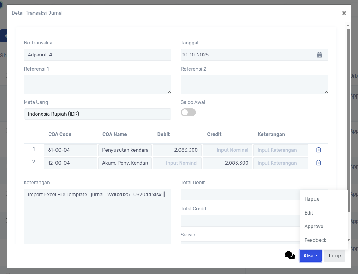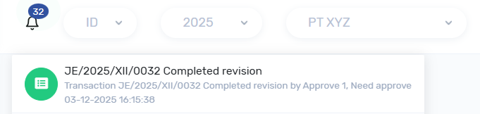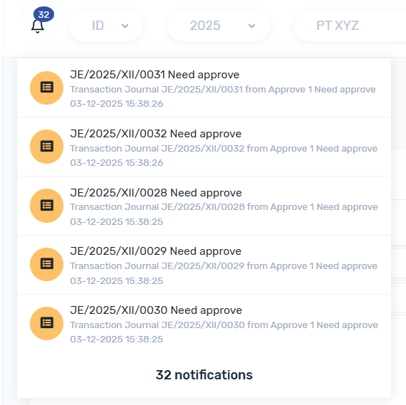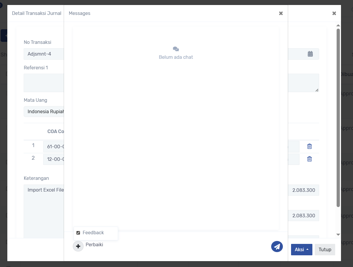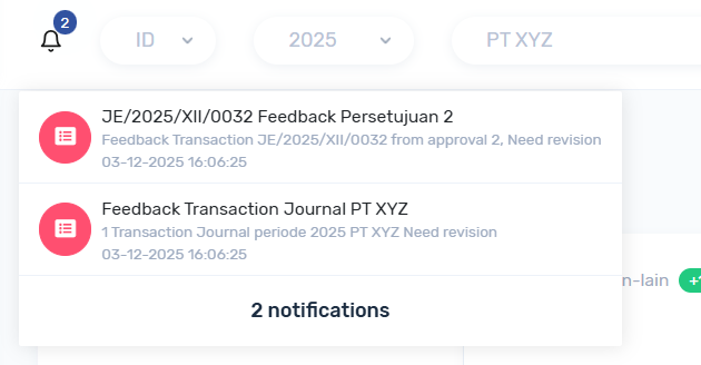 dan pengajuan akan di cek oleh approval dapat ke menu Transaksi -> Jurnal, atau klik notif, ketika ada yg belum sesuai pengajuan dapat di kembalikan ke pengaju, dengan keterangan feedback :