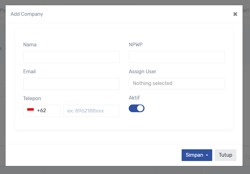 - Assign User (opsional, isi untuk menunjuk user mengerjakan pembukuan di perusahaan tersebut)