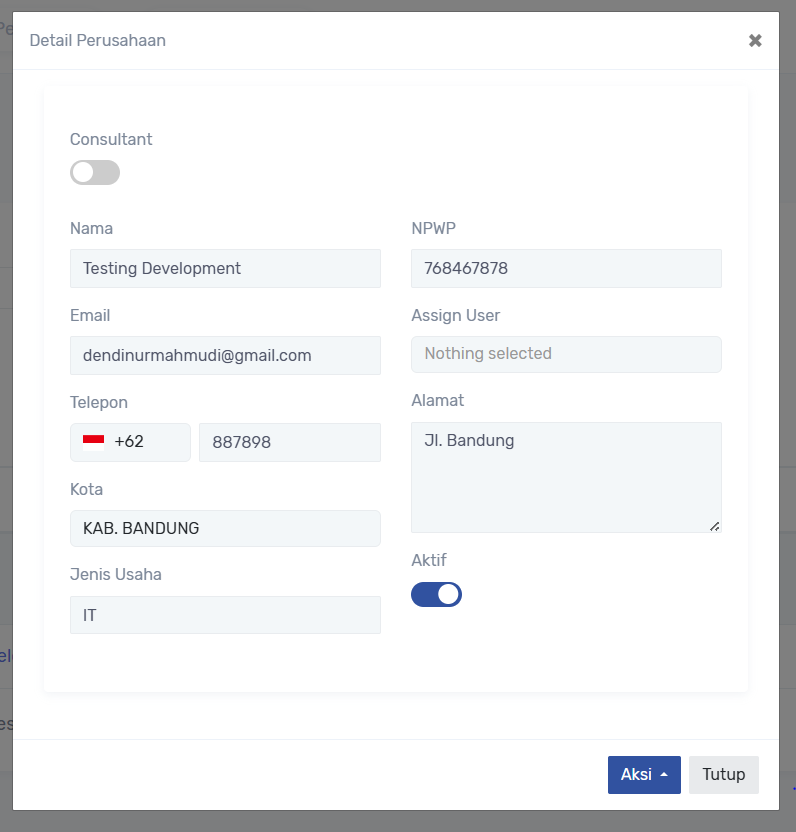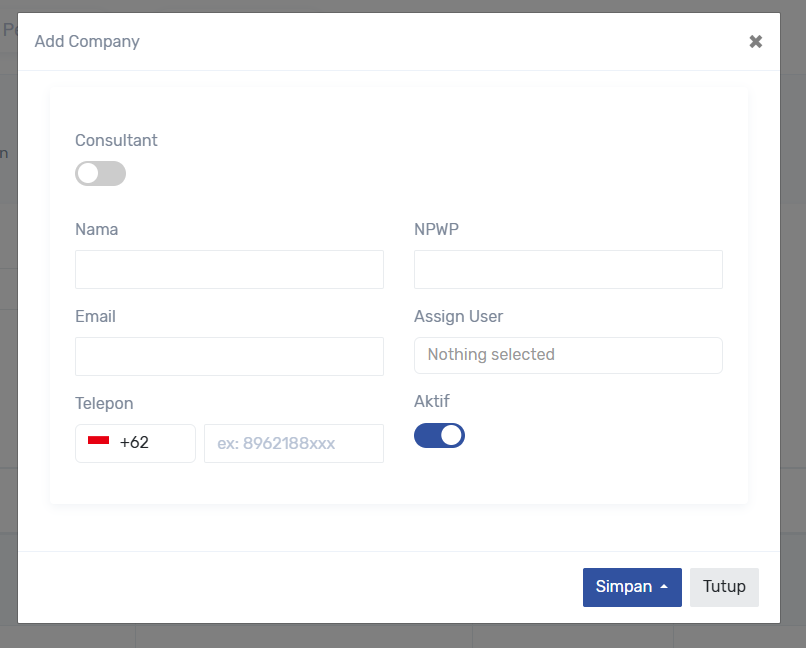 Terdapat toogle untuk perusahaan tersebut Consultant atau bukan, jika di aktifkan maka perusahaan yg ditambah aksesnya adalah Consultant dan Email wajib diisi agar user perusahaan tersebut dapat login ke sistem dan menambah client untuk mereka kerjakan proses pembukuan.