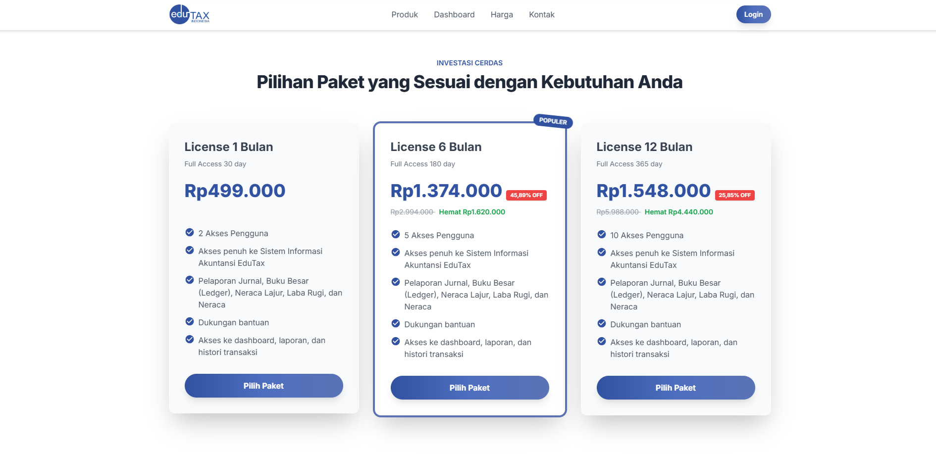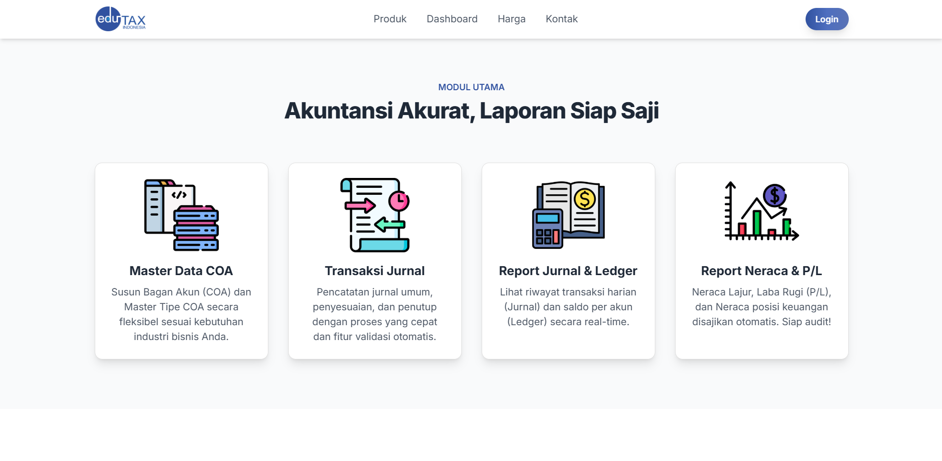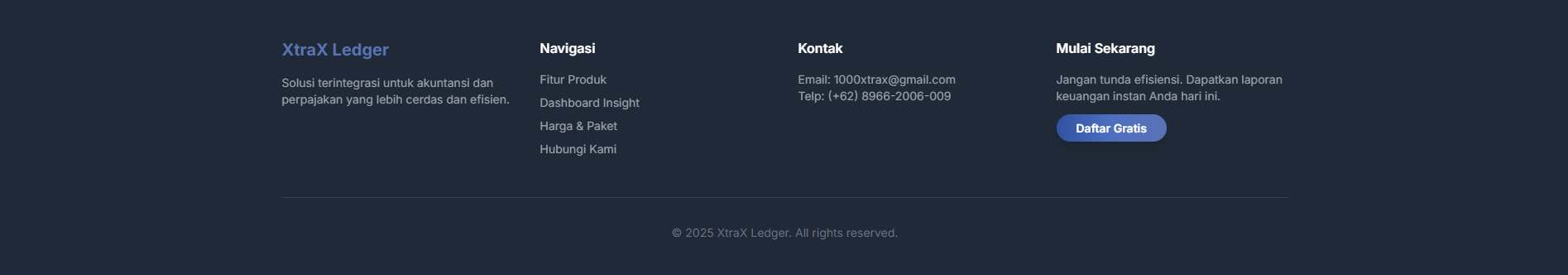 Halaman Utama web apps XtraX Ledger, terdapat keterangan produk, preview dashboard, harga berlangganan dan kontak informasi, untuk masuk ke sistem dapat klik button Login di pojok kanan atas, atau klik Coba Gratis untuk Register Akun.