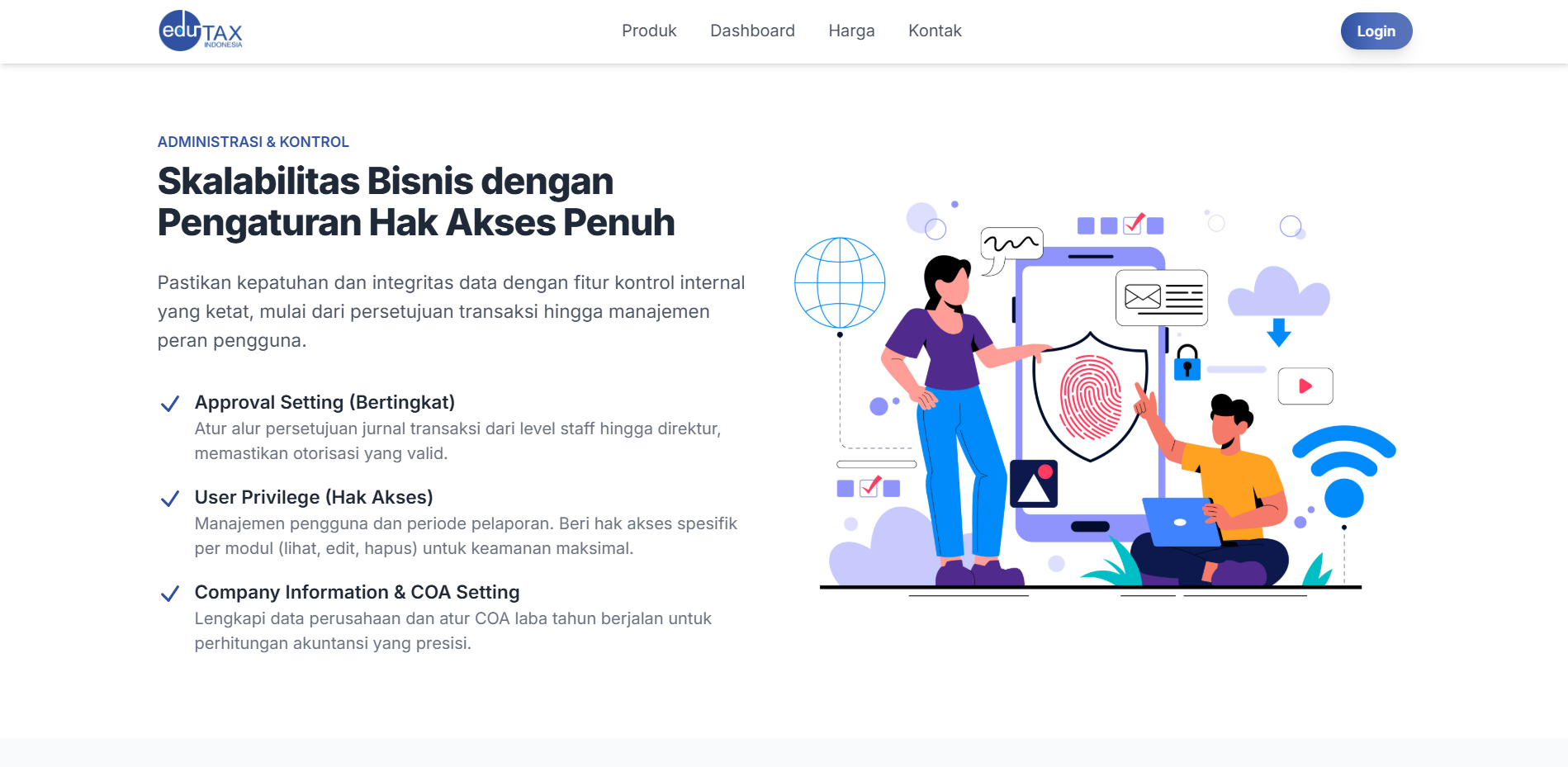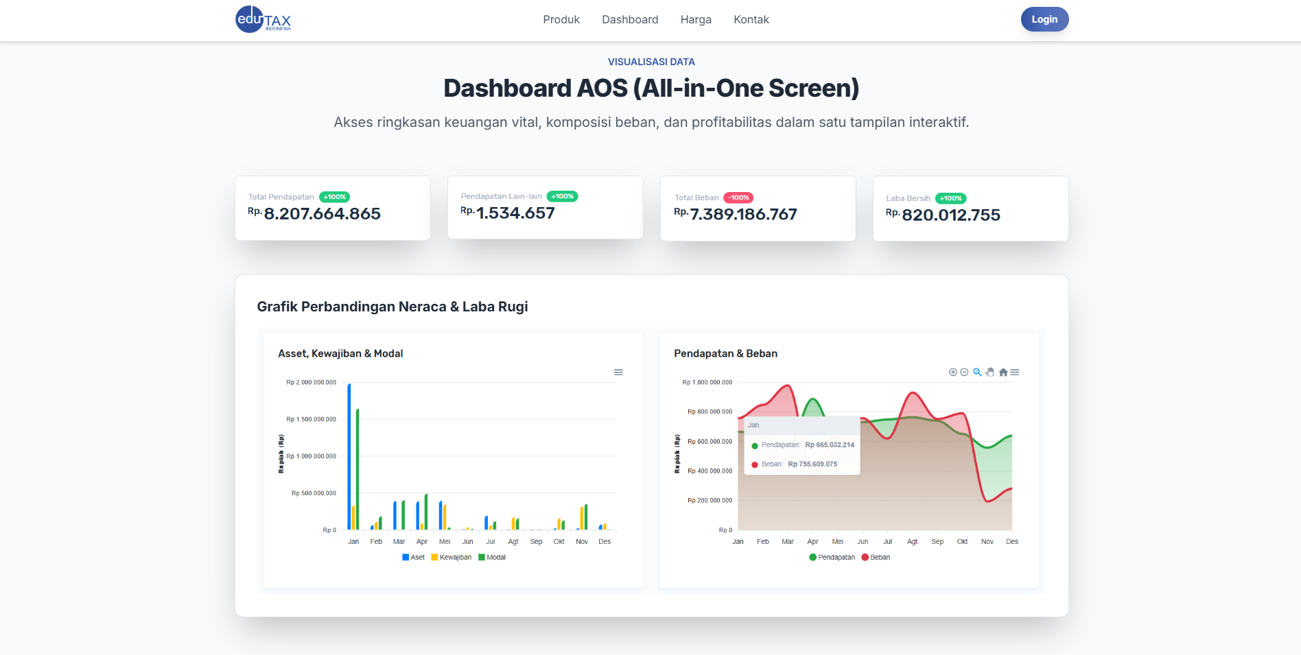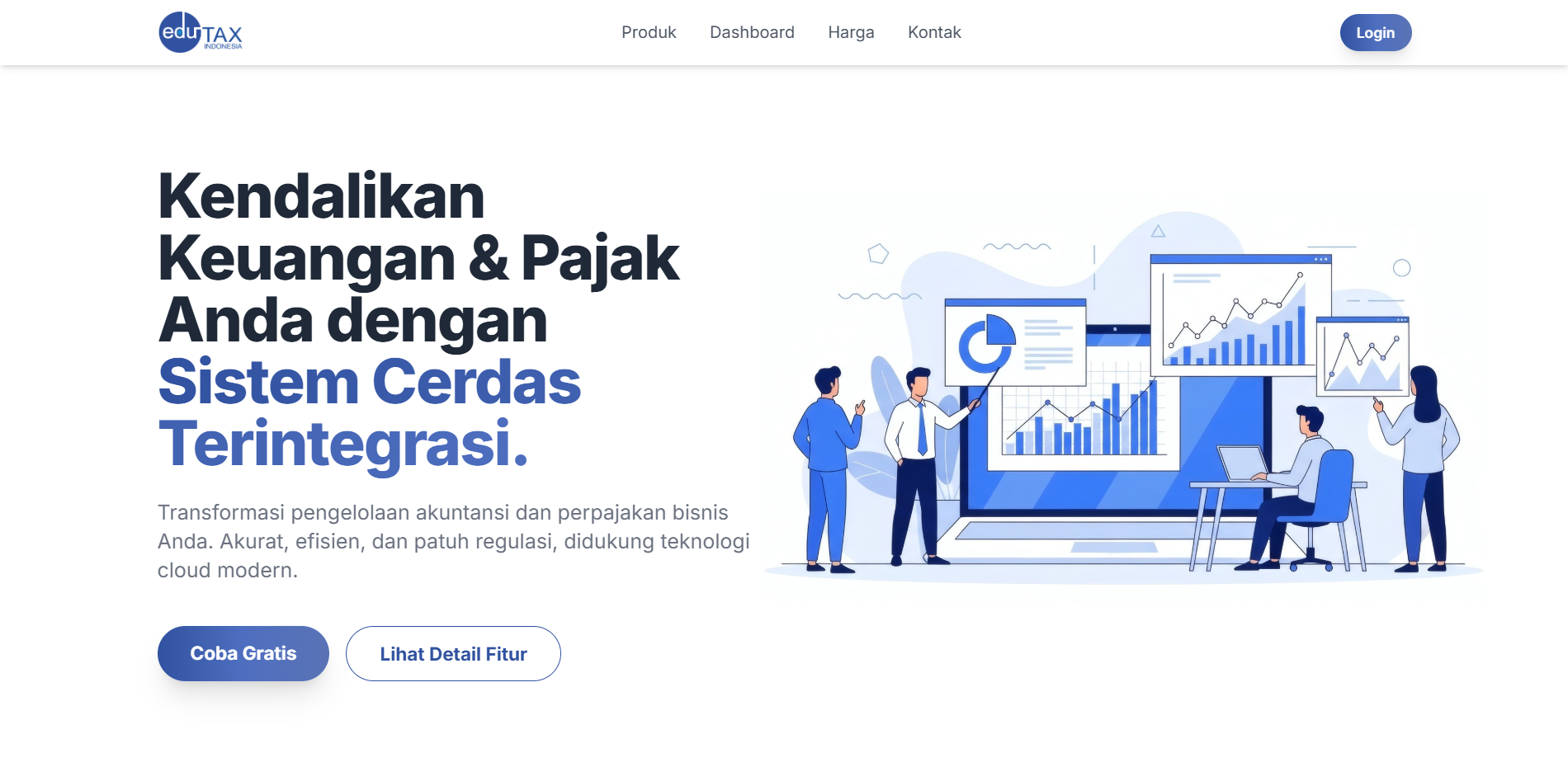 Halaman Utama web apps XtraX Ledger, terdapat keterangan produk, preview dashboard, harga berlangganan dan kontak informasi, untuk masuk ke sistem dapat klik button Login di pojok kanan atas, atau klik Coba Gratis untuk Register Akun.