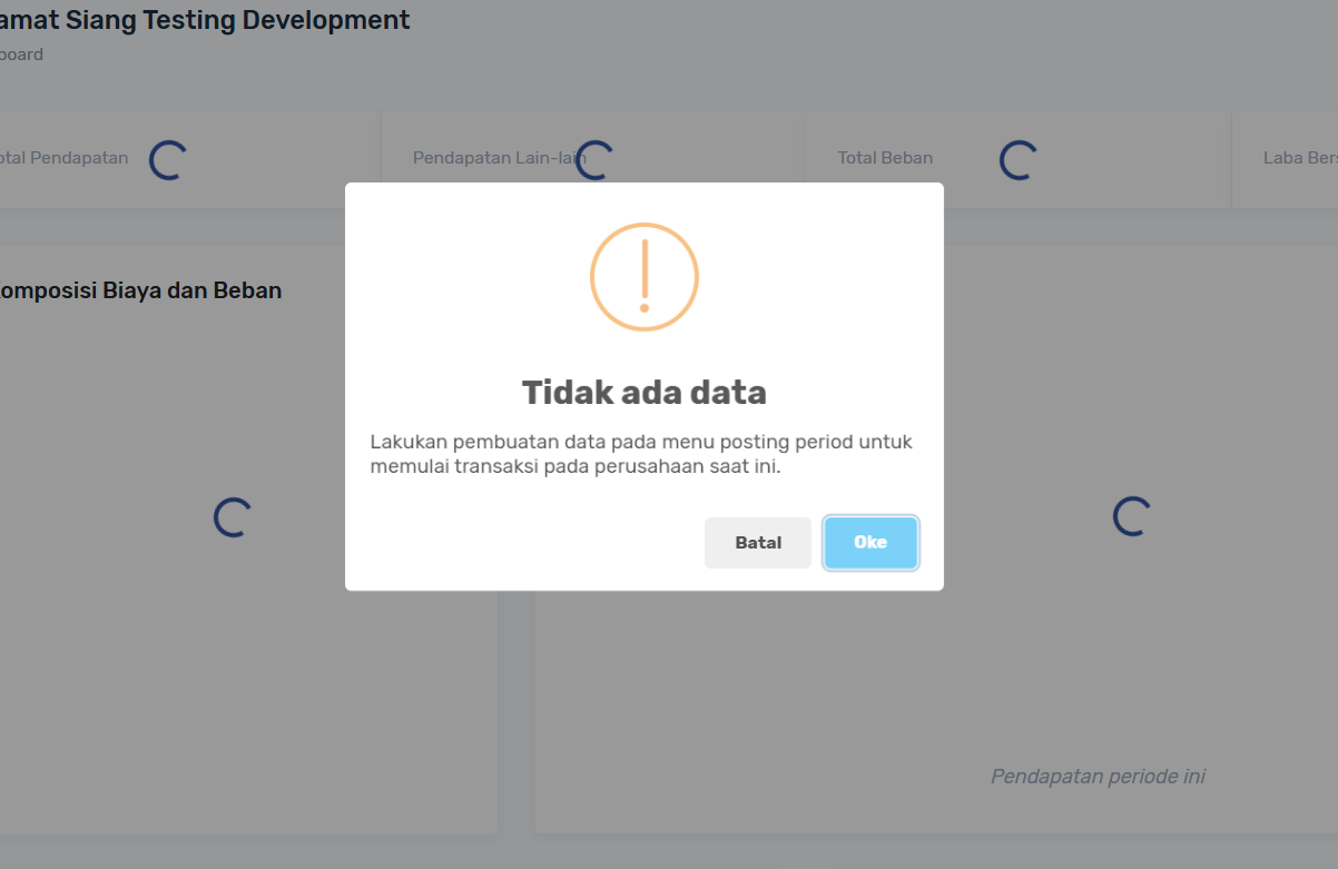 Ketika Periode belum dibuat akan muncul warning berikut ketika selesai login atau dimenu tertentu, ketika di klik OKE akan diarahkan ke menu Open Periode