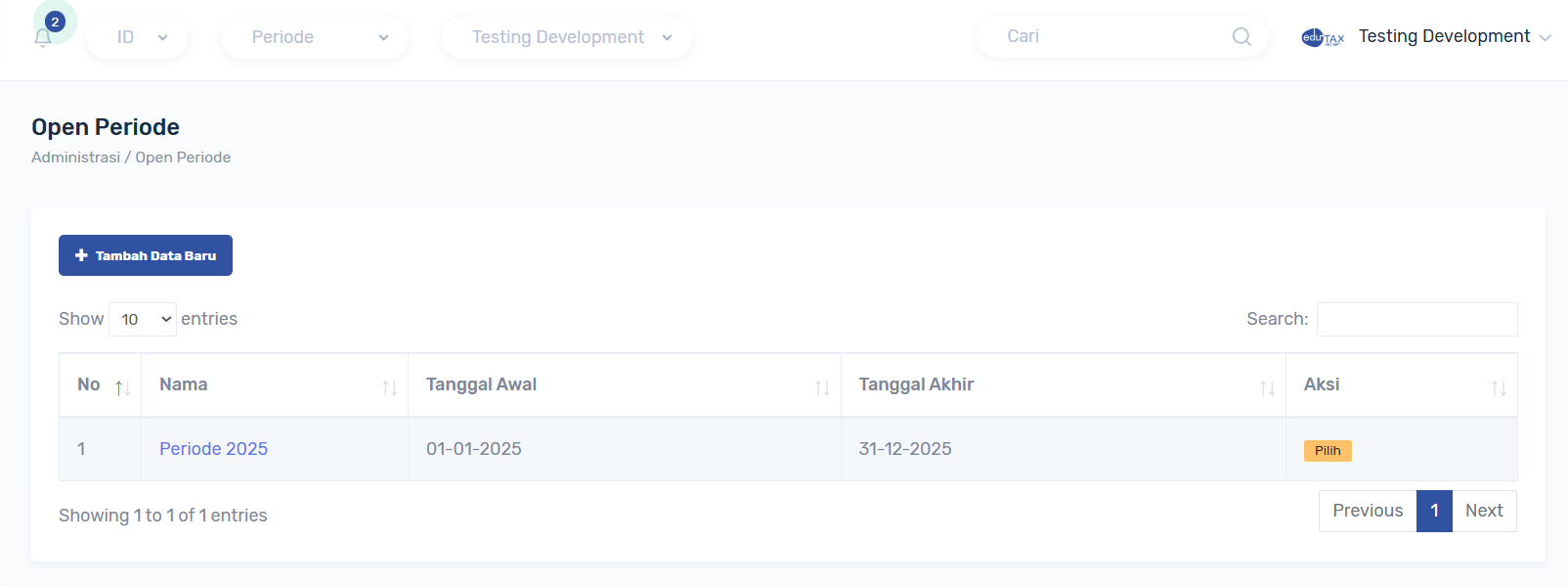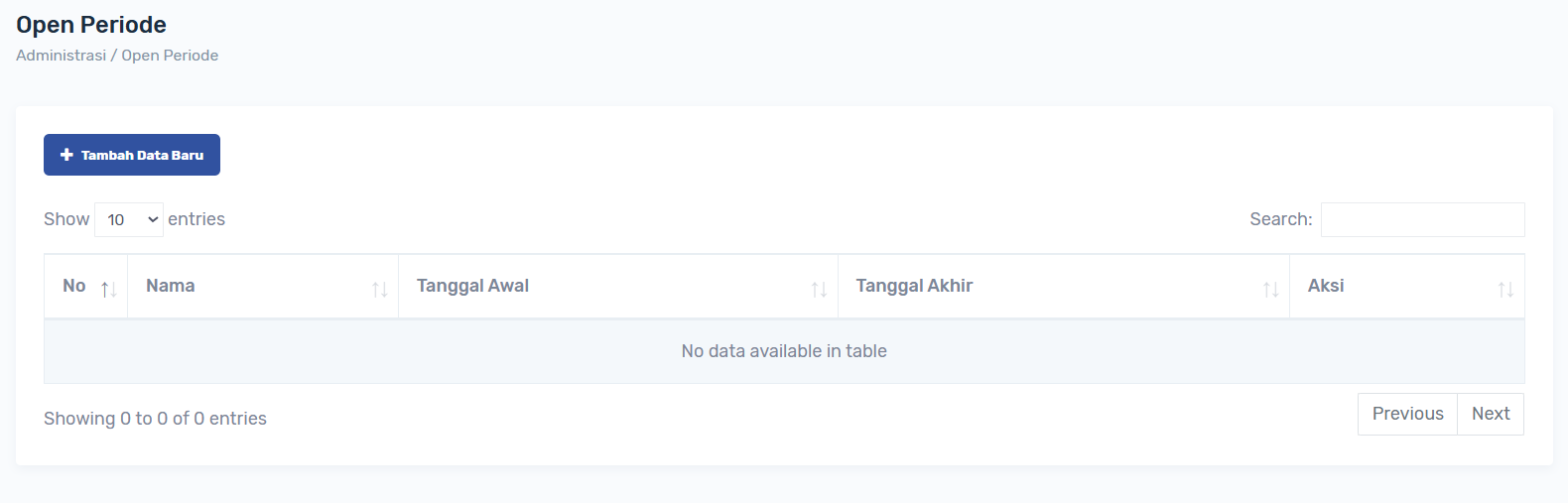Klik +Tambah Data Baru untuk menambah Periode atau pembukuan jurnal yg akan dikerjakan. contoh :
