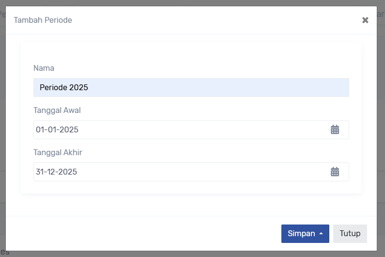 Isikan Nama untuk menandai perode, isi Tanggal Awal dan Tanggal Akhir untuk periode tersebut, klik simpan untuk menyimpan.